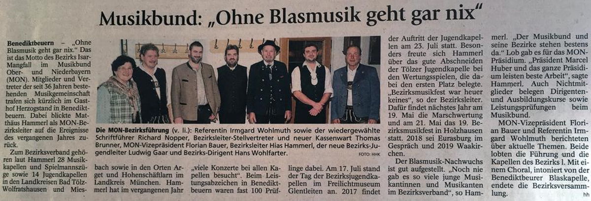Am Mittwoch 21. November 2018 versammelten sich erfreulich viele Mitglieder und Anhänger der an geschlossenen Mitgliedskapellen im Gasthof Altwirt in Münsing zur jährlichen Bezirksversammlung.