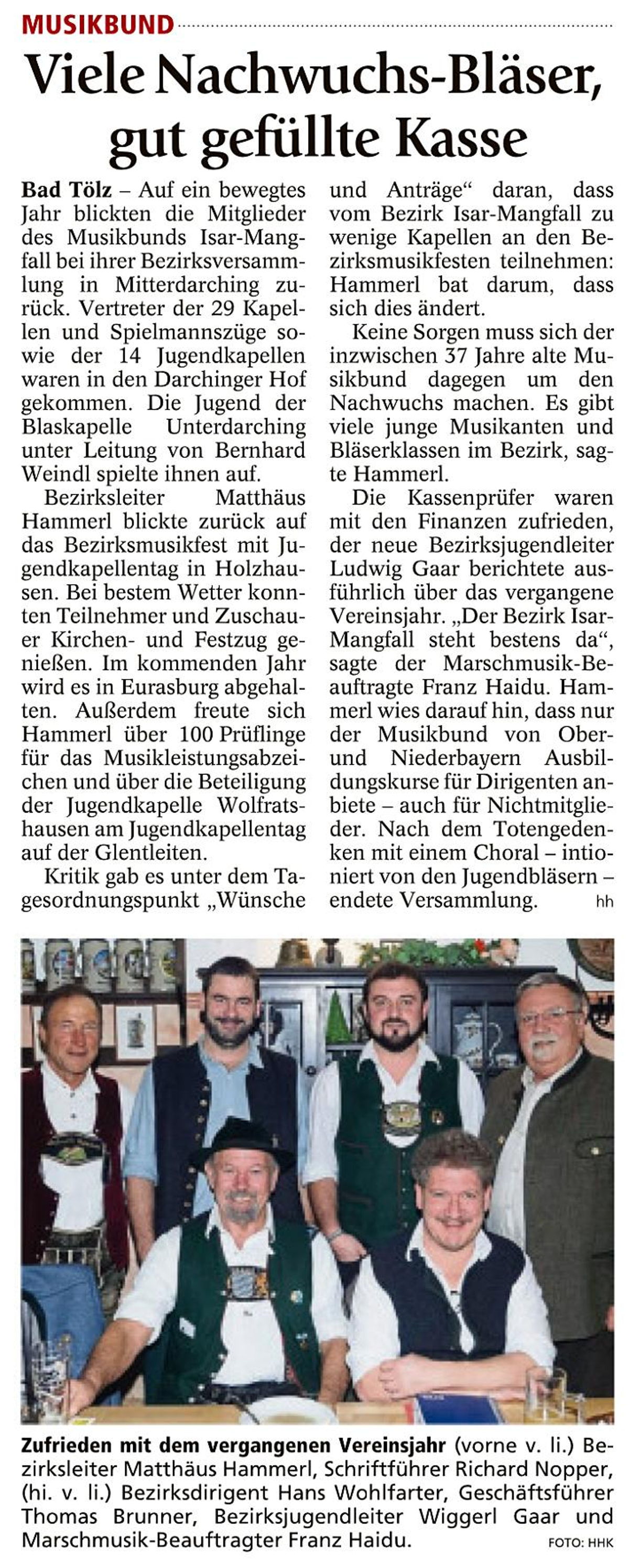 Bezirksleiter Matthäus Hammerl konnte neben den Mitgliedern auch die Vertreter des Musikbundes Franz Haidu und Franz Kellerer begrüßen. Musikalisch wurde die Versammlung von der Musikkapelle Münsing unter Leitung von Walter Hofner begonnen, die auch das Gedenken an die